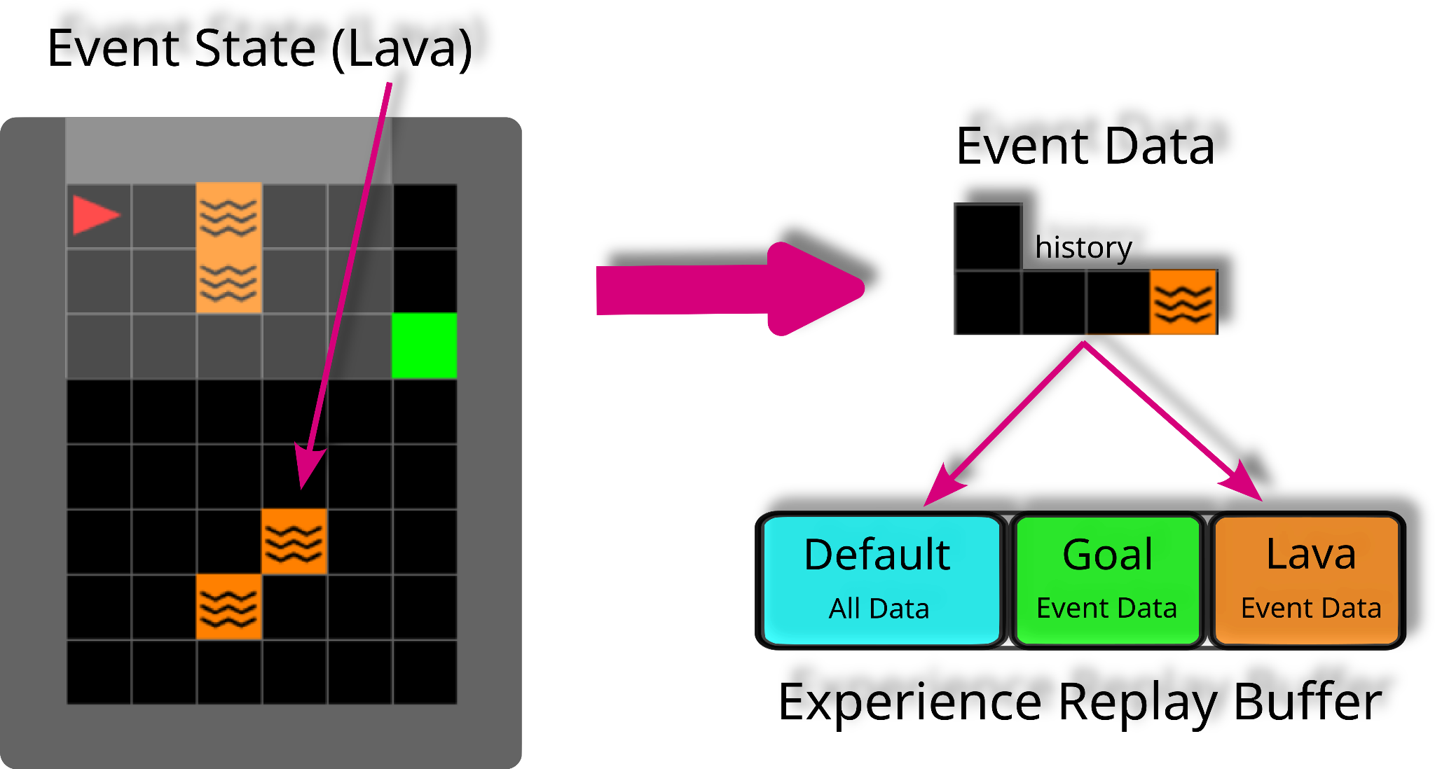 Figure 1 :Example usage of Event Tables in an environment with an agent (red triangle), goal (green square) and lava (orange squares). The buffer is partitioned into a default table and two smaller tables for keeping sub-trajectories that reached the goal or stepped in lava, respectively.