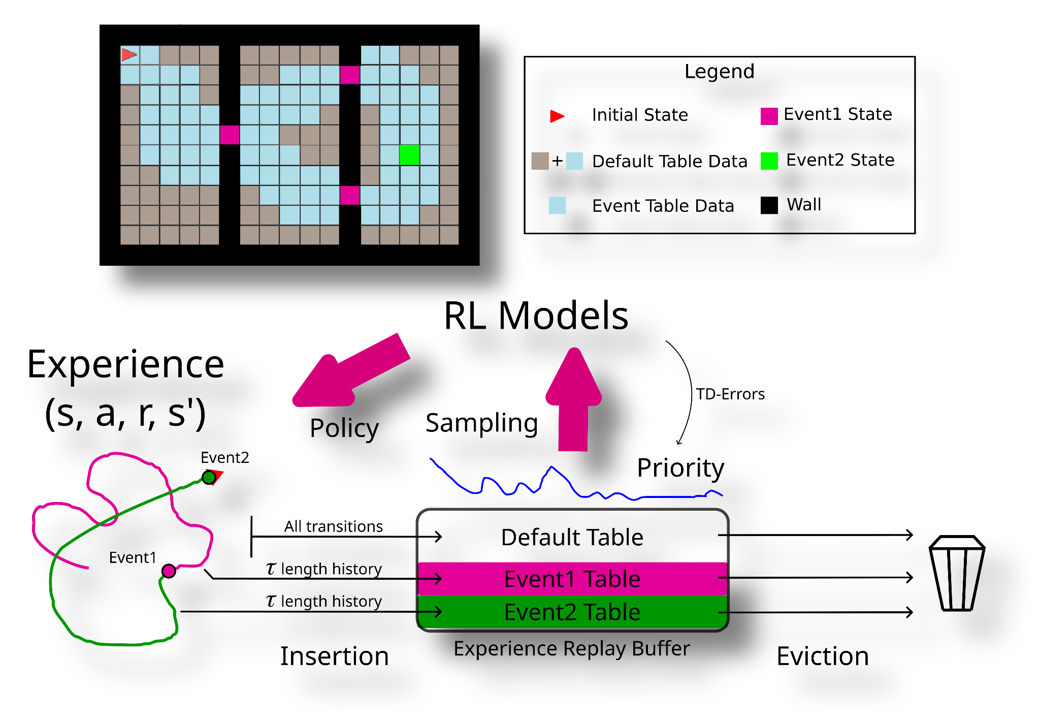 To address the limitations of existing ER methods, in Kompella et al. 2022 we introduced the use of Event Tables (ETs) to supplement the standard replay buffer. ETs, as shown in Figure 1 below, are partitions within the ERB dedicated to storing sub-trajectories leading to significant events. The tables not only store the important events that we want to emphasize, but also a truncated history of experience that led up to that event. By stitching the sub-trajectories together, the agent will have a “fast lane” for shaping behavior between events and the initial state.