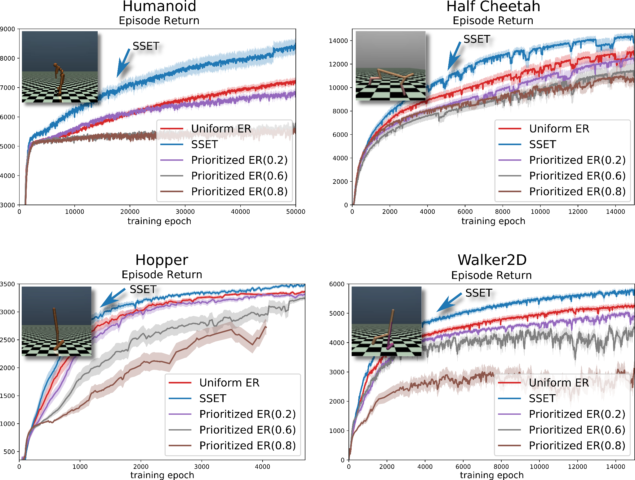 SSET outperforms various parameterizations of PER and Uniform sampling in common continuous RL benchmarks.